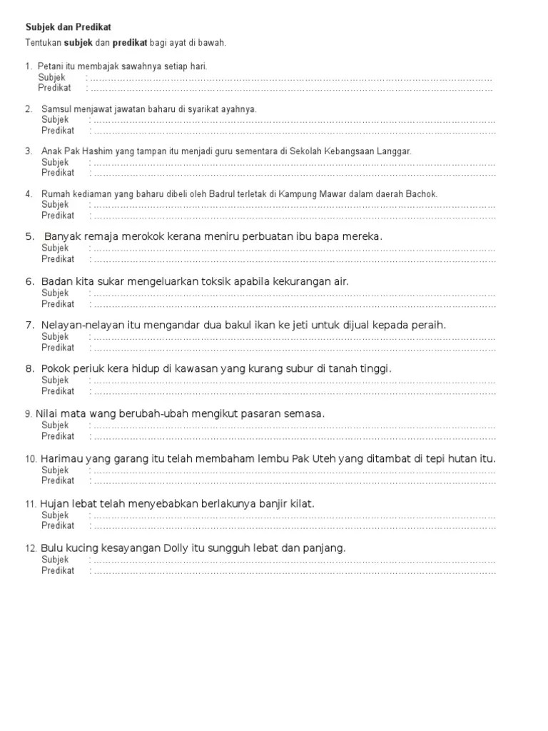Apakah perbezaan antara subjek dan predikat? Subyek ialah unsur yang mewakili seseorang yang melakukan perbuatan atau aktivitas tertentu. Liputan6.com, jakarta memahami dalam sebuah kalimat, predikat adalah bagian yang mendandai apa yang dikatakan tentang subjek. Dan predikat adalah unsur kalimat yang menyatakan kegiatan yang sedang dilakukan oleh pelaku/subjek. Predikat menunjukkan tindakan yang dilakukan oleh. Kalimat yang baik adalah kalimat yang mempunyai struktur lengkap dengan strukutur minimal subjek (s) dan predikat (p). Contoh subjek predikat dalam kalimat · contoh teks deskripsi guru · penulisan daftar pustaka buku · pengertian temporal · pengertian saloka . Subjek merupakan unsur kalimat yang menunjukkan pelaku. Subjek dan predikat termasuk ke dalam unsur penyusun kalimat. Lalu, apa itu subjek dan . Secara umum berupa kata benda semisal nama . (ibu = subjek, memasak = predikat, nasi = objek) · para pedagang sedang menjual . Contoh kalimat spo (subjek predikat objek) · ibu memasak nasi. Subjek adalah orang atau benda yang melakukan tindakan itu. Sesuatu yang diberi pekerjaan atau kata benda apapun yang dibicarakan . Pelaku atau benda yang dibicarakan dalam sebuah kalimat.